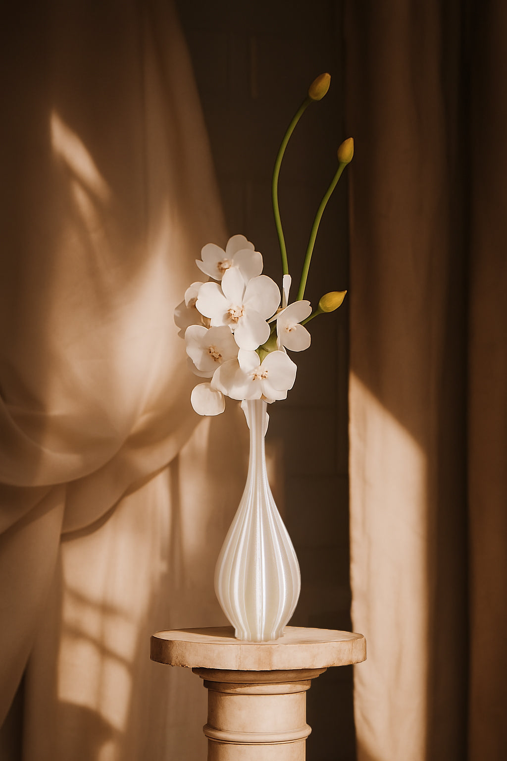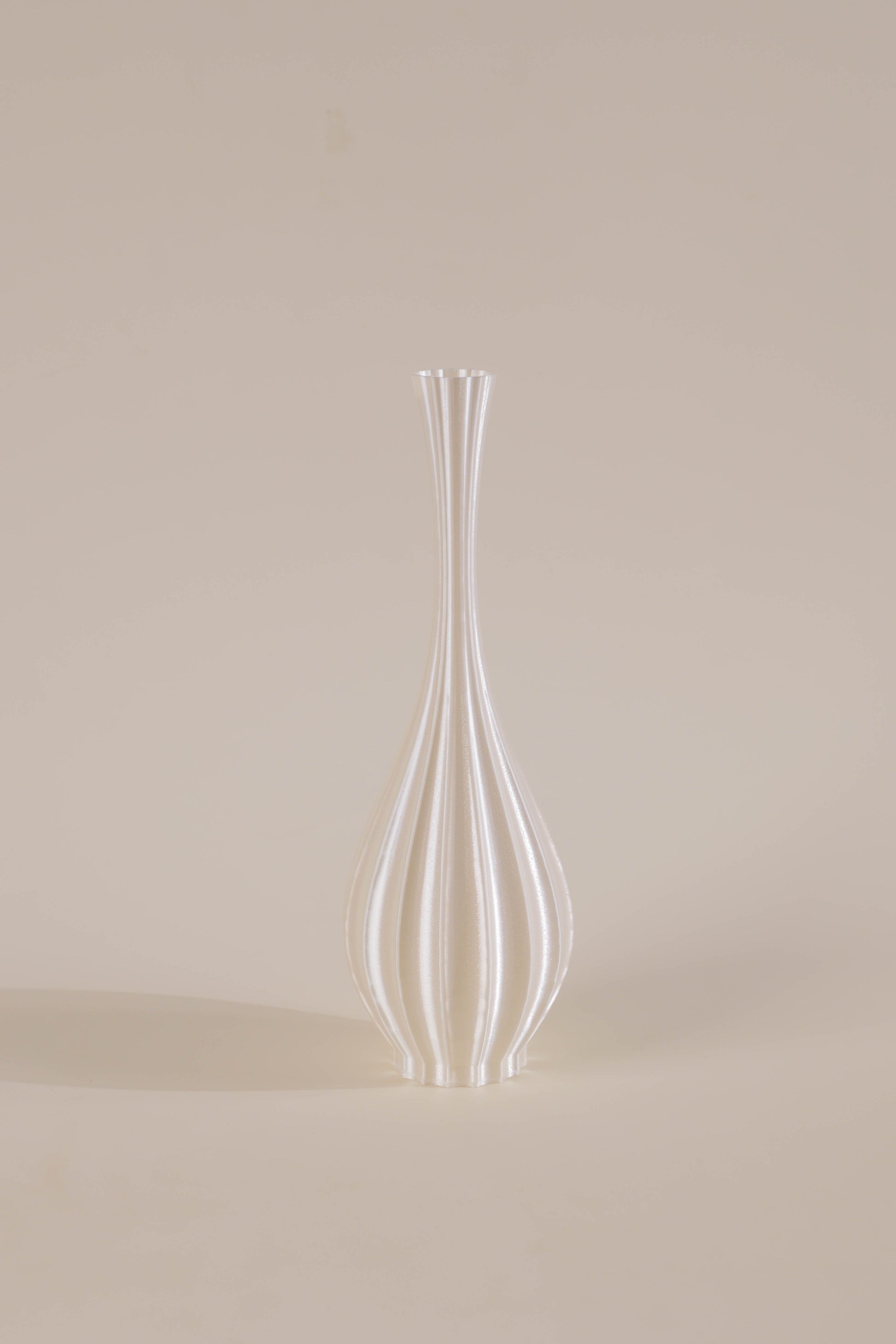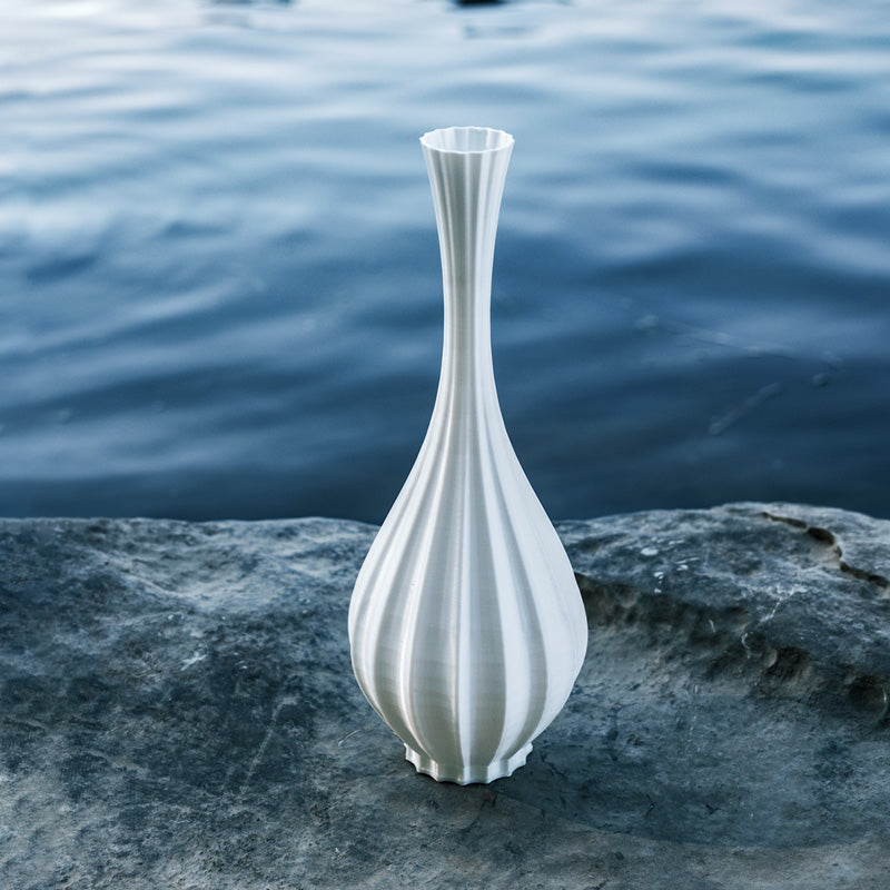 Modeled after the Yuhuchunping (Pear-Shaped Vase) of the Song Dynasty, this design captures the soft curves and harmonious proportions that defined classical Chinese ceramics. The silhouette, reminiscent of a droplet poised in midair, symbolizes purity and renewal, much like the morning dew before it falls. Through 3D printing, the delicate curvature is enhanced, creating a fluid, organic form that feels both ancient and futuristic.