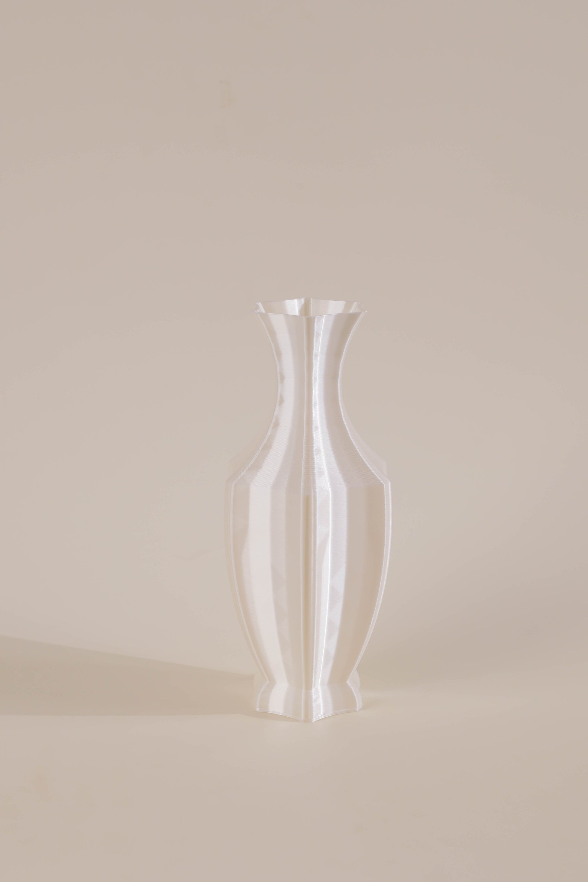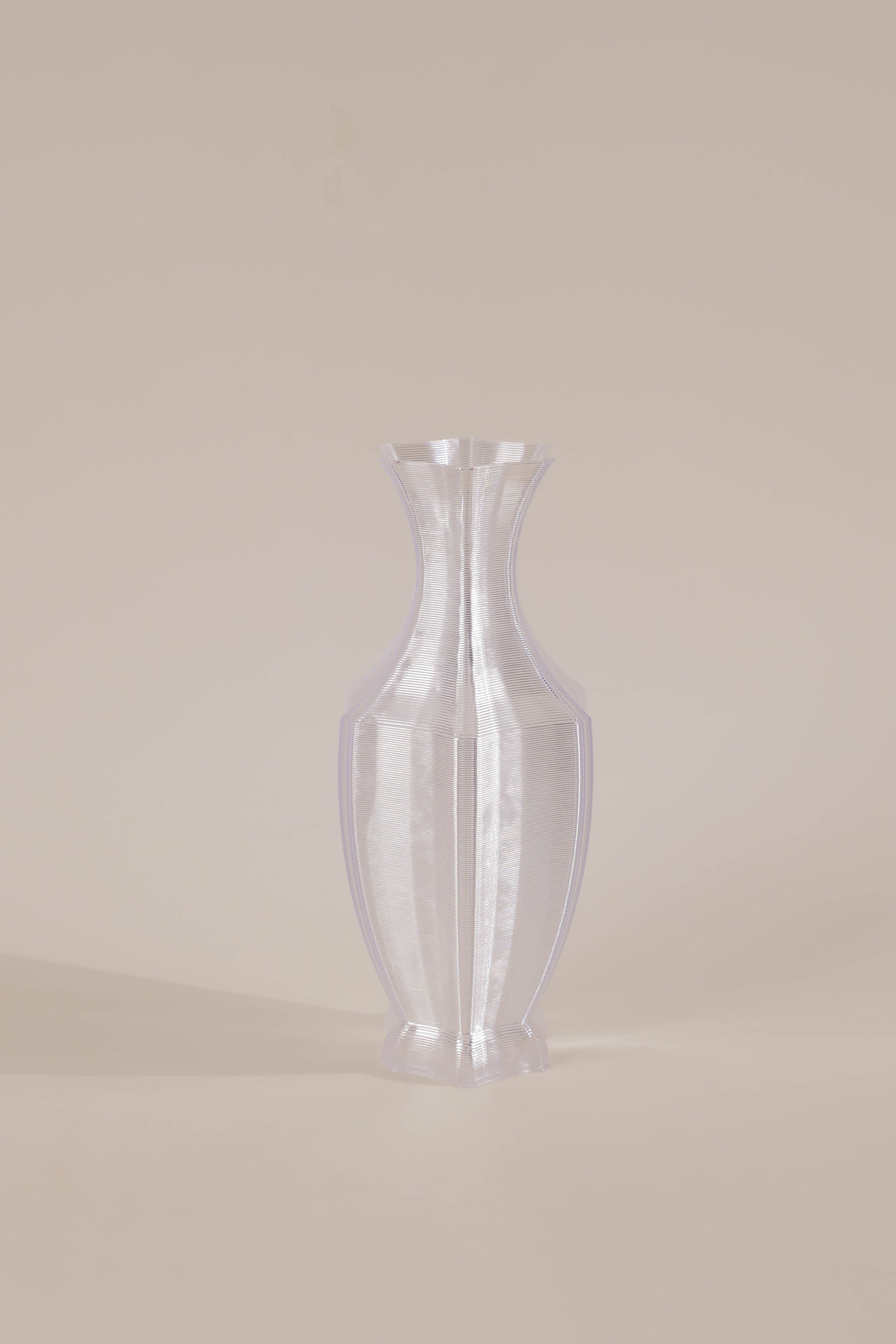 Drawing from the hexagonal vases of the Ming and Qing dynasties, this design introduces faceted surfaces reminiscent of contemporary architectural forms. The structured geometric planes interact dynamically with light, creating a play of highlights and shadows that shift throughout the day. Traditionally, hexagonal vases symbolized balance and stability; here, the form is reimagined with modern digital precision, bridging the past and present.